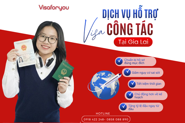 Dịch vụ hỗ trợ visa công tác Gia Lai giúp doanh nghiệp và cá nhân chuẩn bị hồ sơ đúng chuẩn, đúng mục đích và phù hợp với yêu cầu của từng quốc gia. Với cách tiếp cận chuyên nghiệp và minh bạch, Visa For You là đơn vị hỗ trợ đáng tin cậy cho các nhu cầu công tác quốc tế.Thông tin liên hệ: 0918422248 - 0858088890